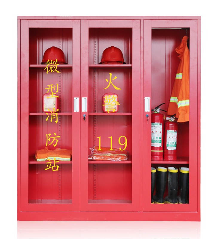消防工具柜介紹:可放置三套消防員個(gè)人防護(hù)裝備,標(biāo)準(zhǔn)微型消防站為6套,兩個(gè)消防器材裝備箱即可。